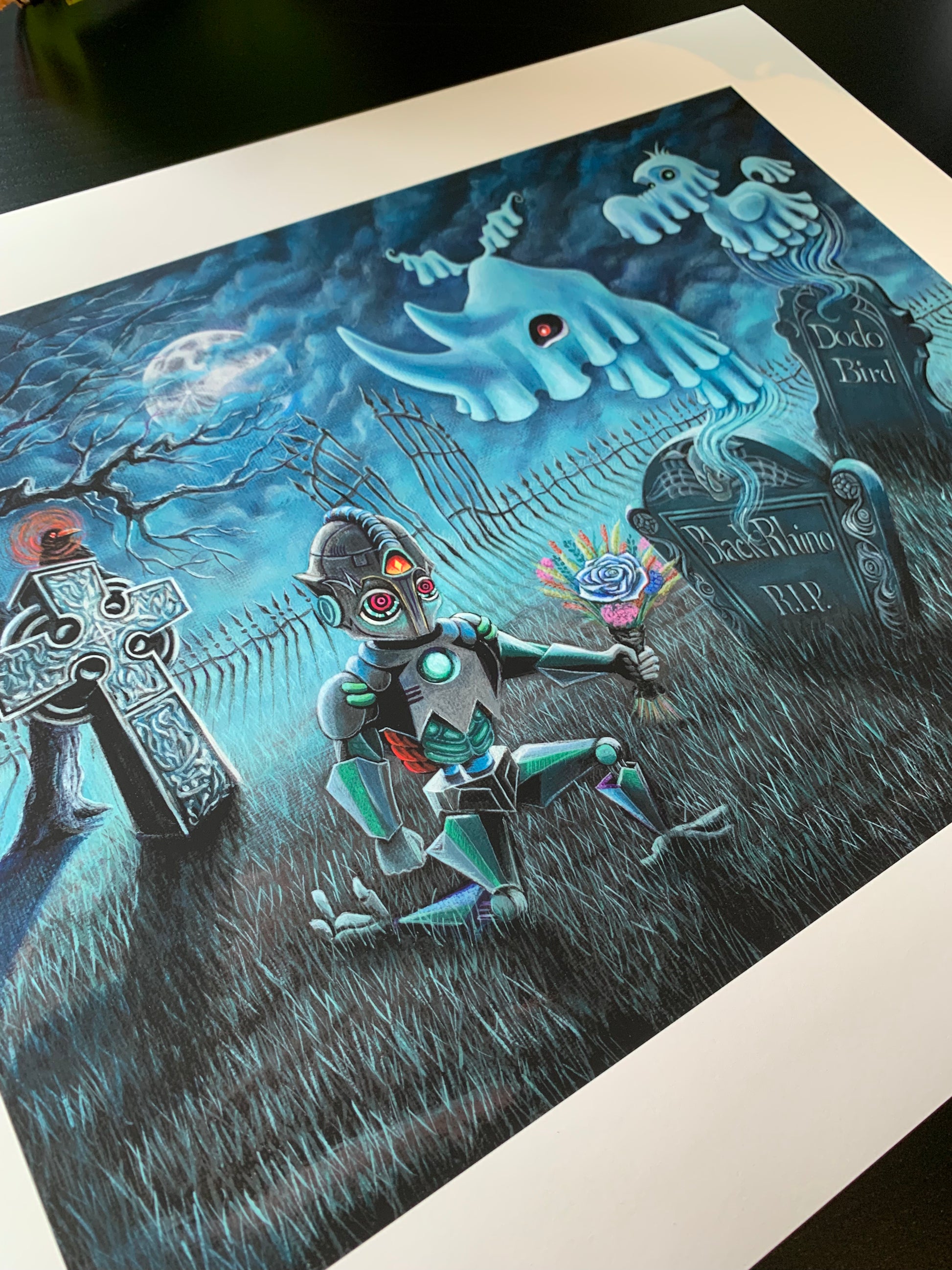This artwork features a sentient robot bringing flowers to the tombstones of extinct animals whilst their souls watch on.